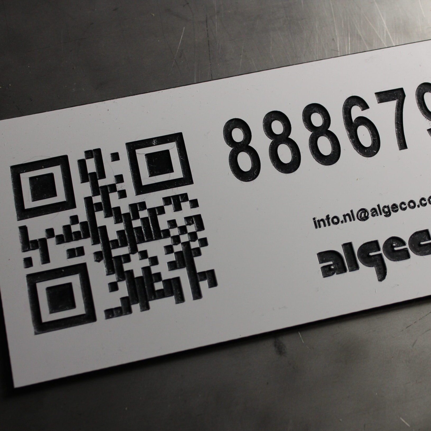 Kunststof nummerplaatjes met QR-codes en logo’s, perfect voor magazijnen en fabrieken. Ze zijn bestand tegen chemicaliën en UV-straling en eenvoudig te bevestigen voor product- en machine-identificatie.